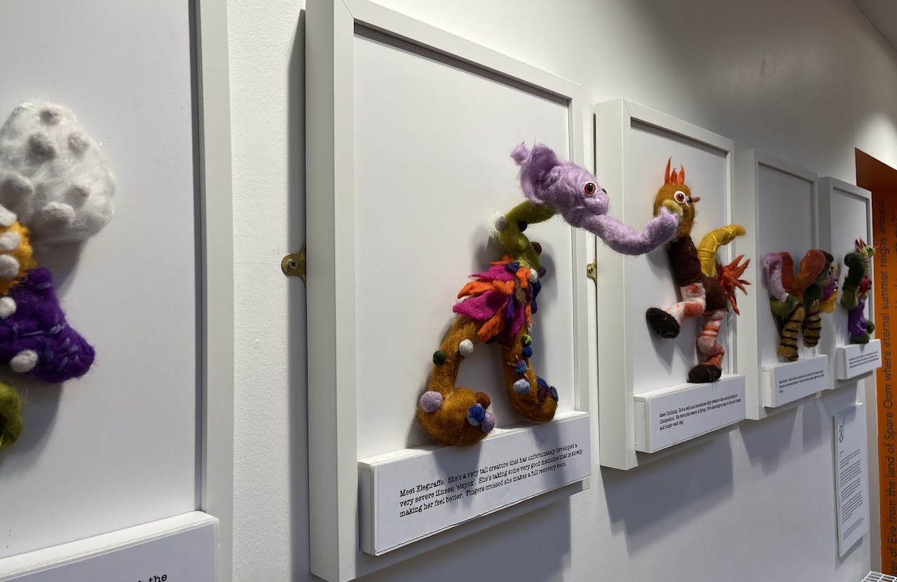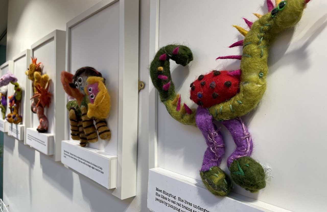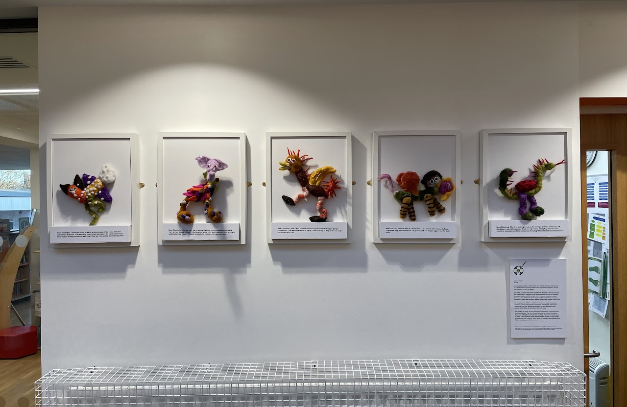 Once the felt was made, the two-dimensional material was turned into three-dimensional shapes. This was achieved by sewing the felt into the desired shapes and stuffing them with polyester wadding, similar to how teddy bears are made. These individual shapes were then sewn together, by the children, to create their Crazy Creature. Stories about the creatures were created by the children and displayed with the artwork.