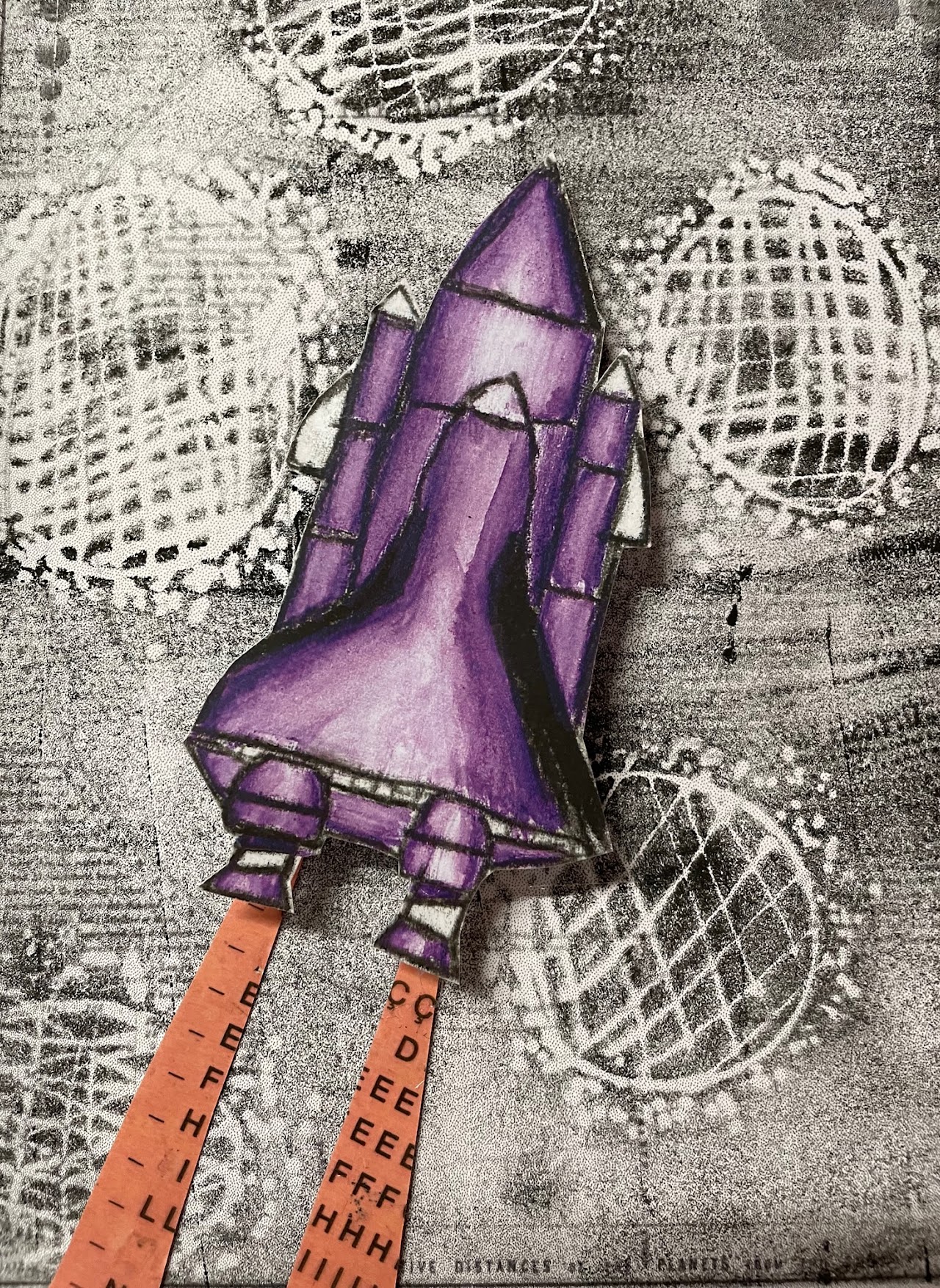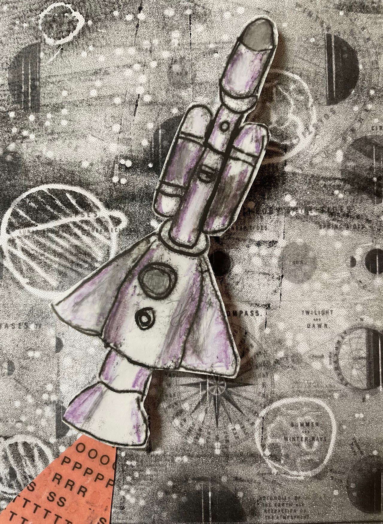 The rockets, reduced in size on the photocopier, have been mounted onto maps of the solar system to illustrate their destination. Further manipulation of the map backgrounds using block-printing techniques was undertaken, before applying cut orange papers to represent the fire generated from the rocket boosters.